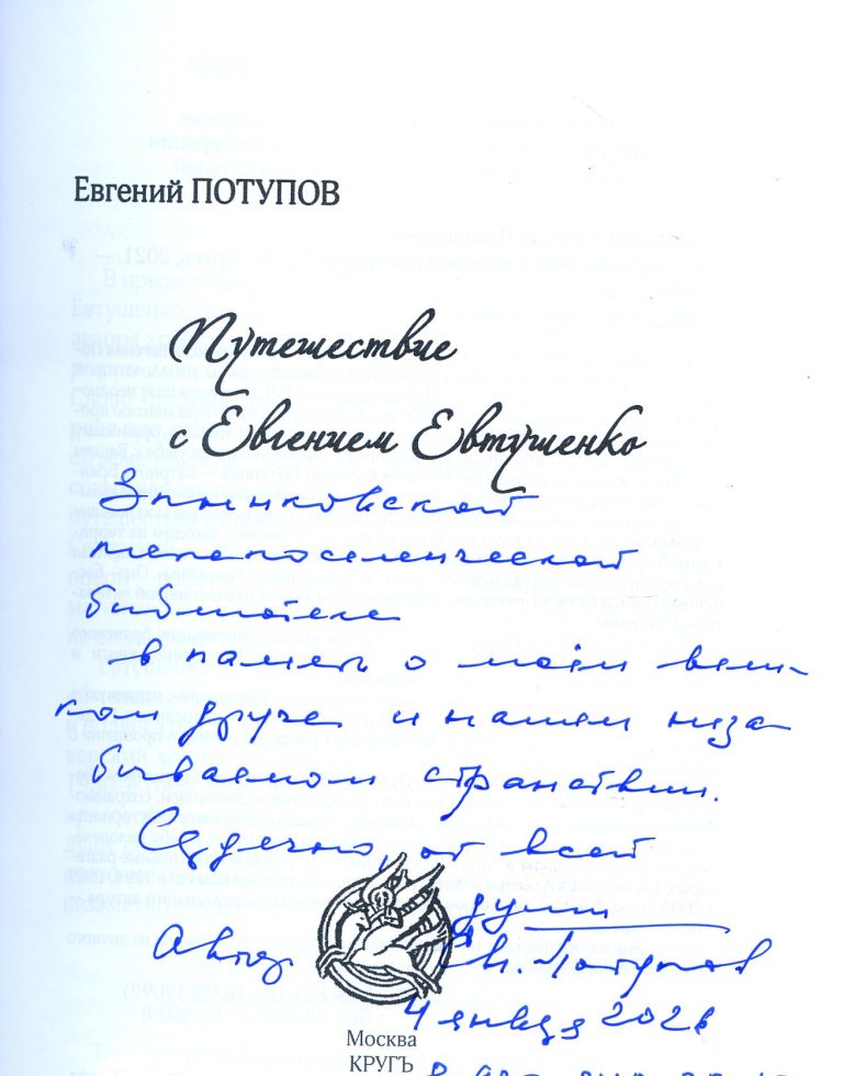 «Злынковской межпоселенческой библиотеке в память о о моем великом друге и нашем незабываемом странствии. Сердечно от всей души. Автор Е. Потупов. 4 января 2026 года.» |